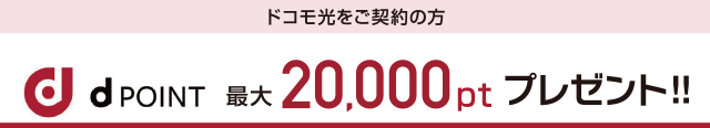 ドコモ光を新規でお申し込みいただいた方、フレッツ光または提携CATV(インターネット)からの転用または他社光サービスからの事業者変更の方に、dポイント2,000pt(期間・用途限定)プレゼント!【ご注意事項】※ペア回線を伴わない「ドコモ光」の単独契約は対象外となります。ただし 「ドコモ光」ご利用開始月の翌月末までにペア回線を設定された場合は対象となり、dポイン ト(期間・用途限定)はご利用開始月の3か月後に進呈いたします。※ポイント進呈時 点でペア回線がdポイントクラブ会員またはドコモビジネスプレミアクラブ会員でない場合はポ イント進呈されません。※特典は予告なく変更(進呈ポイント数の増減含む)または終了 する場合があります。※進呈するdポイント(期間・用途限定)の有効期限は進呈月の1 日から起算して6か月です。 「ポイント交換商品(賞品が当たる抽選、JALマイル・Ponta ポイントへの交換含む)」「ケータイ料金の支払い」「データ量の追加」にはご利用になれませ ん。詳細は「dポイントクラブサイト」でご確認ください。※ドコモビジネスプレミアクラブ会員の 場合はドコモポイントの進呈となります。ドコモポイントは「ケータイ料金の支払い」にはご利用 になれません。